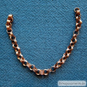A chain made from small coils of bronze wire. The individual coils are have a variable width between 3 and 5 turns of wire.