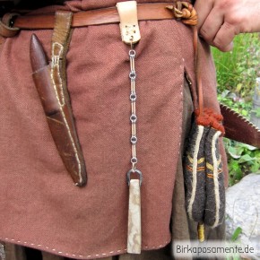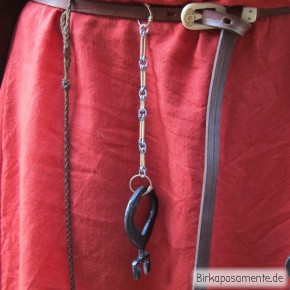 Das Kettchen kann sowohl als Schmuck oder zum Aufhängen von Gegenständen an Fibeln oder dem Gürtel genutzt werden. Auf Wunsch kann ich feste Ringe oder Haken an den Enden anbringen oder auch Gegenstände fest mit dem Kettchen verbinden.